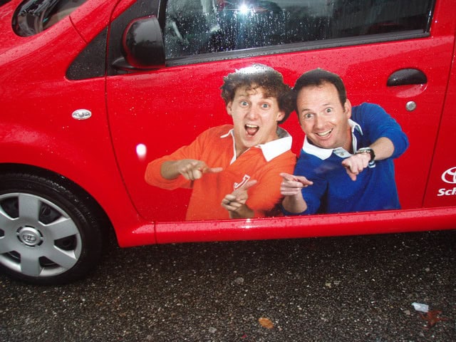 Jut en Jul op een auto voor de sponsor Energy4all.