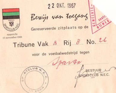 Voor deze ‘Uit de oude doos’ nemen we je mee naar zondag 8 oktober 1967. Dat jaar zal vooral de boeken ingaan als het jaar waarin NEC met 9-1 verloor van Ajax (grootste nederlaag ooit van NEC), op 5 november. Maar het was ook de tijd van glorie in Nijmegen, ons NEC speelde voor het eerst in de eredivisie en deed het zeker niet onverdienstelijk, we zouden uiteindelijk als 10e eindigen dat jaar. De Goffert was iedere wedstrijd goed gevuld met gemiddeld 17.350 supporters en NEC hoorde daarmee bij de grote jongens in het land. Onze kleuren werden dat seizoen onder andere verdedigd door roemruchte namen als Tini van Reeken, Hans Venneker (topscoorder in 1967-1968 met 19 doelpunten), Bennie Werts en niet te vergeten de witte schicht in het doel, Nico de Bree.