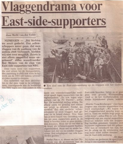 Behalve de vlaggen met creatieve teksten waren er natuurlijk ook zat vlaggen met daarop “East-Side”. Het was dan ook een groot drama toen in december 1982 tijdens een uitwedstrijd bij Twente alle vlaggen werden gejat en in brand werden gestoken in een Twente-vak. Met name Tante Toos – de moeder van de East-Side – zat helemaal in zak en as. Gelukkig kwam alles goed. NEC regelde namelijk een nieuwe vlag die overhandigd werd door trainer Pim vd Meent.