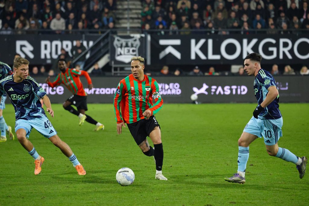 De laatste wedstrijd van dit kalenderjaar voor NEC was er meteen eentje om de vingers bij af te likken. Nummer 3 Ajax kwam immers op bezoek in de Goffert bij de nummer 4 (!) van Nederland: ons eigen NEC. Bij winst op Ajax zouden we zelfs die derde plek weer overnemen. Maar ja, het blijft natuurlijk wel Ajax. De Amsterdammers hebben onder interim-coach Grim de weg omhoog weer gevonden. Vorig seizoen had NEC natuurlijk die schitterende uitoverwinning in de Arena, maar verloor het thuis ondanks een huizenhoog veldoverwicht met 1-2 door twee goals van Wout Weghorst. Weghorst ontbrak vandaag, maar met Dolberg in de spits was Ajax wellicht nog gevaarlijker. Ook troffen we aan Ajax-zijde voormalig huurling Youri Baas, die na zijn tijd bij NEC op de linkerflank omgetoverd is tot een centrale verdediger. Aan NEC-zijde speelde uiteraard huurling Kaplan tegen zijn werkgever, nadat hij tegen Telstar nog geschorst was.