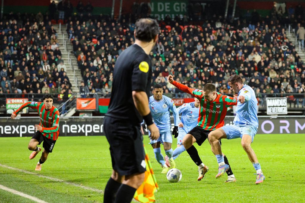 In de 13e minuut snoepte Dasa de bal af van Duijvenstein maar zijn schot was te gehaast om het de van PSV gehuurde keeper Drommel lastig te maken. Aan de andere kant had de Spartaanse Japanner Mito opeens de gelijkmaker op zijn hoofd, maar Crettaz keerde met een katachtige redding. Het gaf echter wel aan dat het een hele open wedstrijd was waar NEC echt op haar tellen moest passen. Na een goed half uur werd een inzet van Kaplan uit een corner van de lijn gehaald en schoot Nejasmic in de rebound huizenhoog over. Richting het einde van de eerste helft werd Sparta sterker en leek NEC wat te verslappen. Toch had NEC vlak voor de rust nog de beste papieren voor een uitbreiding van de score, met een opnieuw teleurstellende Chery die opzichtig van dichtbij naast kopte uit een uitstekende voorzet van Ouaissa. Diezelfde Ouaissa werd in de extra tijd van de eerste helft overduidelijk gevloerd in het strafschopgebied, maar bizar genoeg wuifde arbiter Oostrom het in eerste instantie weg en floot hij zelfs voor de rust. Gelukkig had de VAR vandaag wel de bril op en haalde Oostrom naar de kant om zijn stommiteit nogmaals te aanschouwen. De scheids haalde bakzeil en Ogawa kreeg de kans om zijn tweede van de avond te scoren. Dit deed hij gelukkig ook, al zat Drommel er nog wel aan. Daarmee ging NEC comfortabel – zij het wat geflatteerd – met 2-0 de rust in.