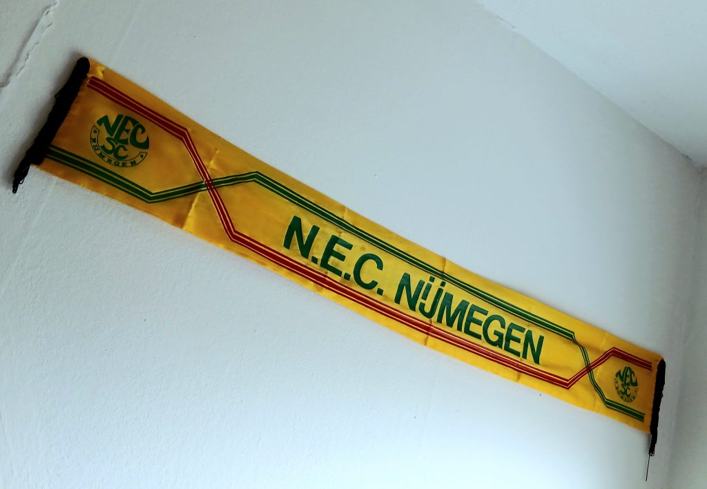 Terug naar andere tijden. Eind jaren ’70 was ik de enige NEC-supporter in Grave. In de 1ste helft van de jaren ’80 kon je de NEC-fans op mijn Nijmeegse middelbare school op de vingers van 1 hand tellen. Het woord merchandise kenden we in Nijmegen nog niet: er was nauwelijks iets te koop. Rood-groen-zwarte sjaals en truien werden door moeders en oma’s met de hand gebreid.